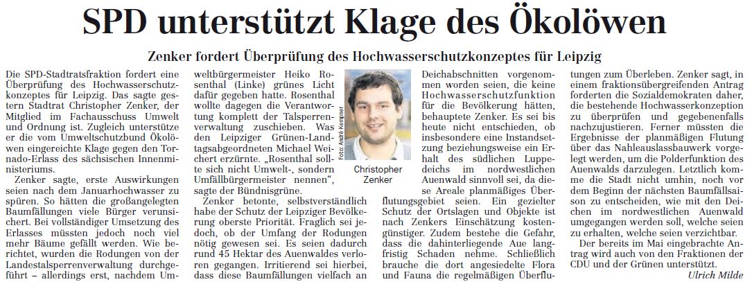 SPD unterstützt Klage des Ökolöwen - Zenker fordert Überprüfung des Hochwasserschutzkonzeptes für Leipzig