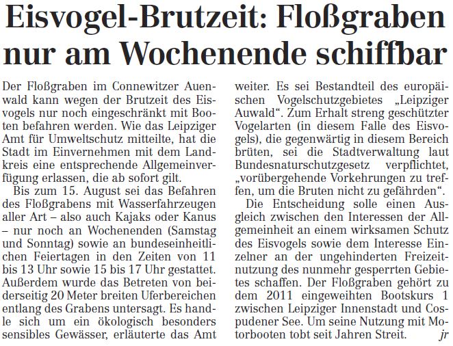 Eisvogel-Brutzeit: Floßgraben nur am Wochenende schiffbar