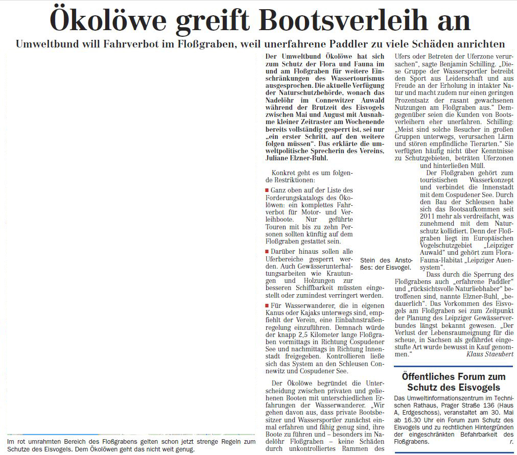 Ökolöwe greift Bootsverleih an - Umweltbund will Fahrverbot im Floßgraben, weil unerfahrene Paddler zu viele Schäden anrichten
